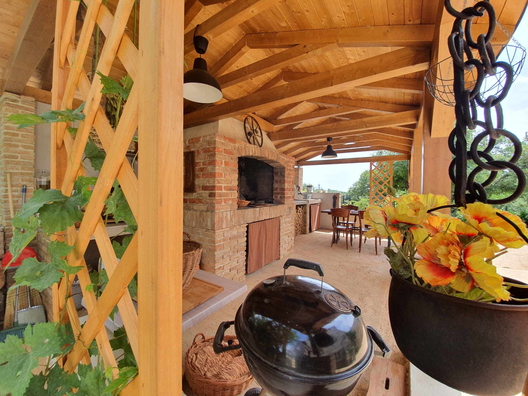 Gather around the traditional masonry stove, where warmth and conversation flow easily at the cozy table. For a change of pace, enjoy another shaded table nestled beneath the trees — perfect for meals, games, or simply relaxing outdoors.